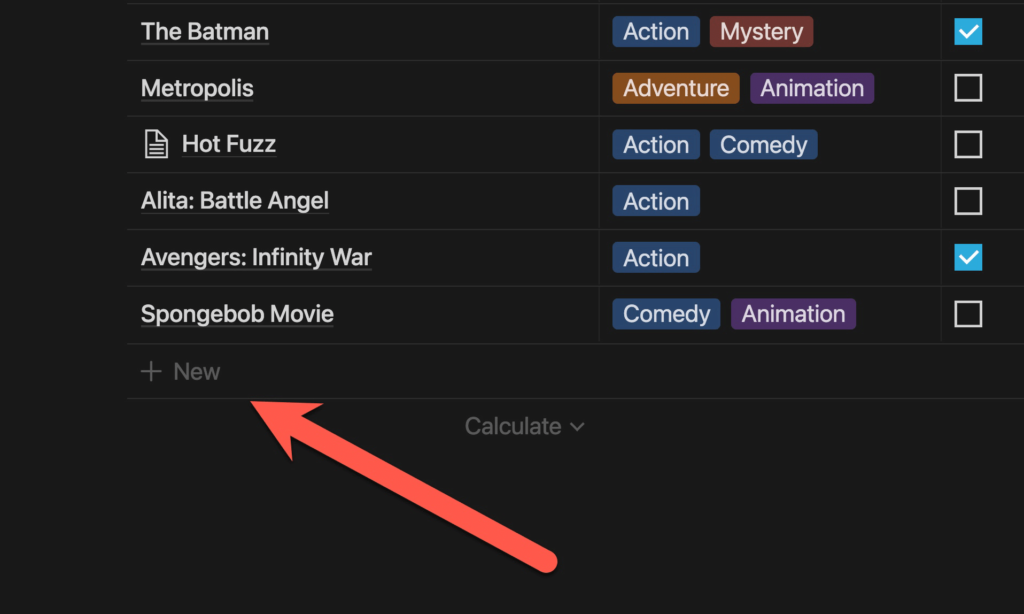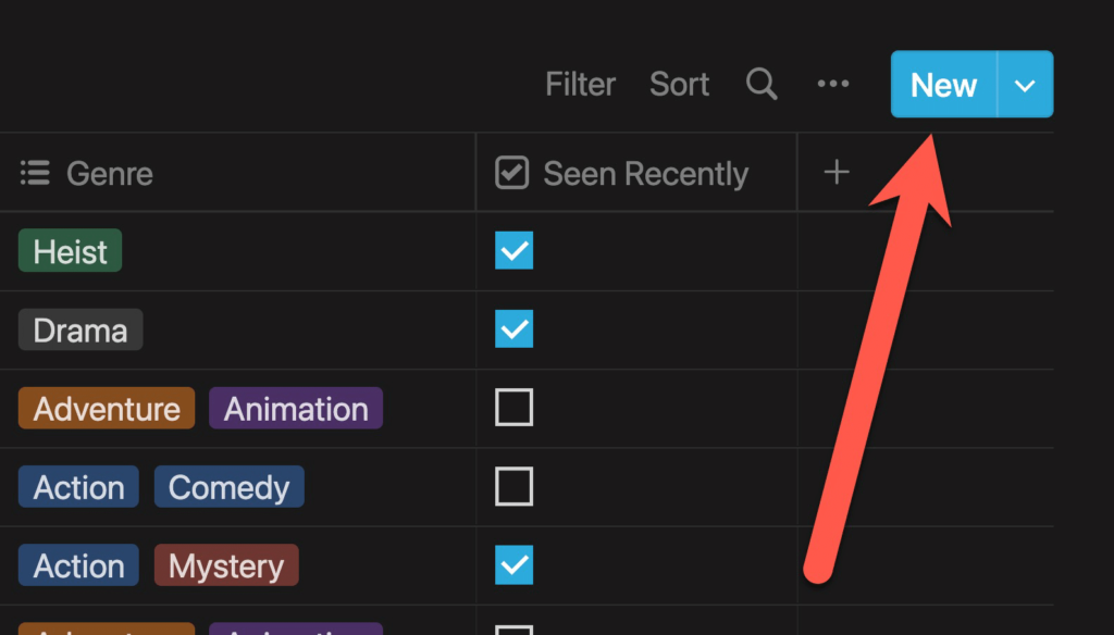 Perlu dicatat bahwa ini adalah satu-satunya cara untuk menambahkan satu baris yang akan menyesuaikan dengan view filter secara otomatis. Contoh: jika view di atas memiliki filter “Genre: Action”, lalu baris baru yang kamu tambahkan akan secara otomatis ditandai dengan Action. Ini disebut dengan forcing function.