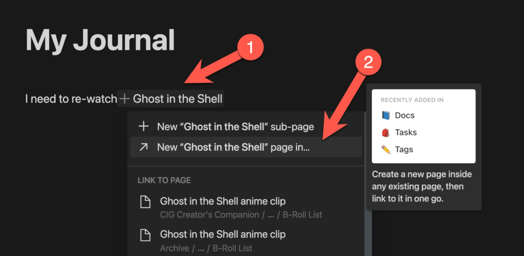 Contohnya, row baru bisa ditambahkan ke database Movies dari mana saja dengan mengetik “+Ghost in the Shell”, lalu pilih ‘New “Ghost in the Shell” page in..’, kemudian pilih database Movies untuk dijadikan sebagai destinasi database. Kamu bisa mempelajari lebih lanjut tentang menghubungkan page Notion dengan panduan yang sudah aku buat.